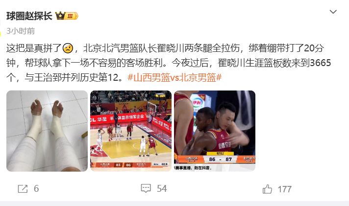 北京赢得不容易,但代价也是惨重的,翟晓川又拉伤了,赛后赵探长晒出了川队双腿缠满绷带的照片,表示:翟晓川两条腿全部拉伤,绑着绷带打了20分钟。